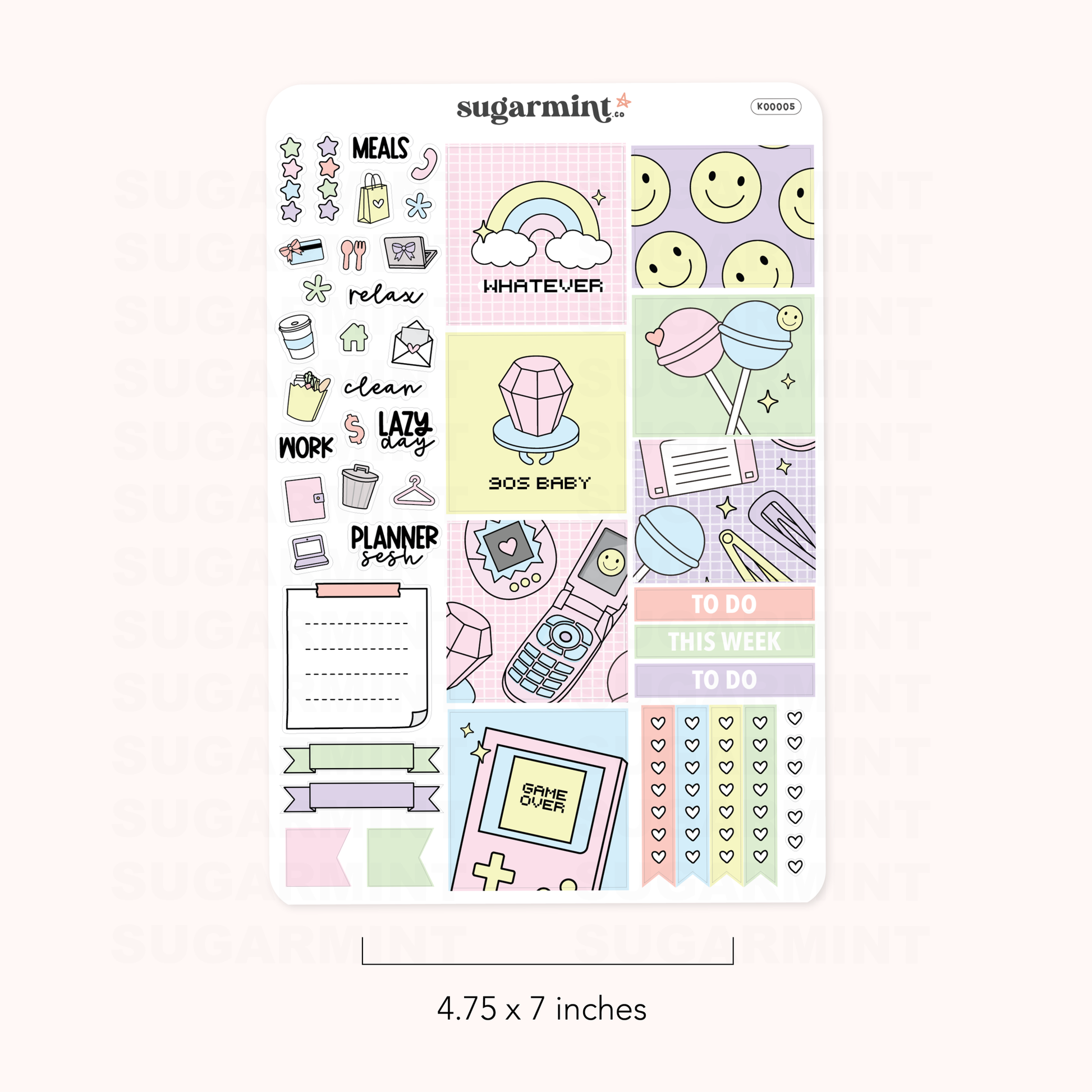 Get ready to feel nostalgic with our 90's Baby Planner Sticker Kit! This two-sheet collection features beloved relics from the past like Gameboys, Tamagotchis, and more, all with a pastel spin. Get your 90s on and get organized!