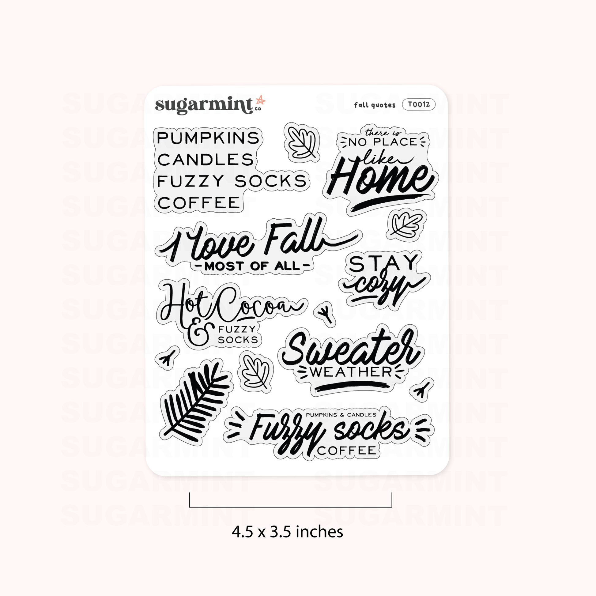 Introducing our Fall Quotes sticker sheet! Get into the autumn spirit with these charming quotes, including "Pumpkins. Candles. Fuzzy Socks. Coffee" and "I Love Fall Most of All." Perfect for adding some cozy vibes to your planner, journal, or scrapbook. Printed on Clear Glossy Paper.