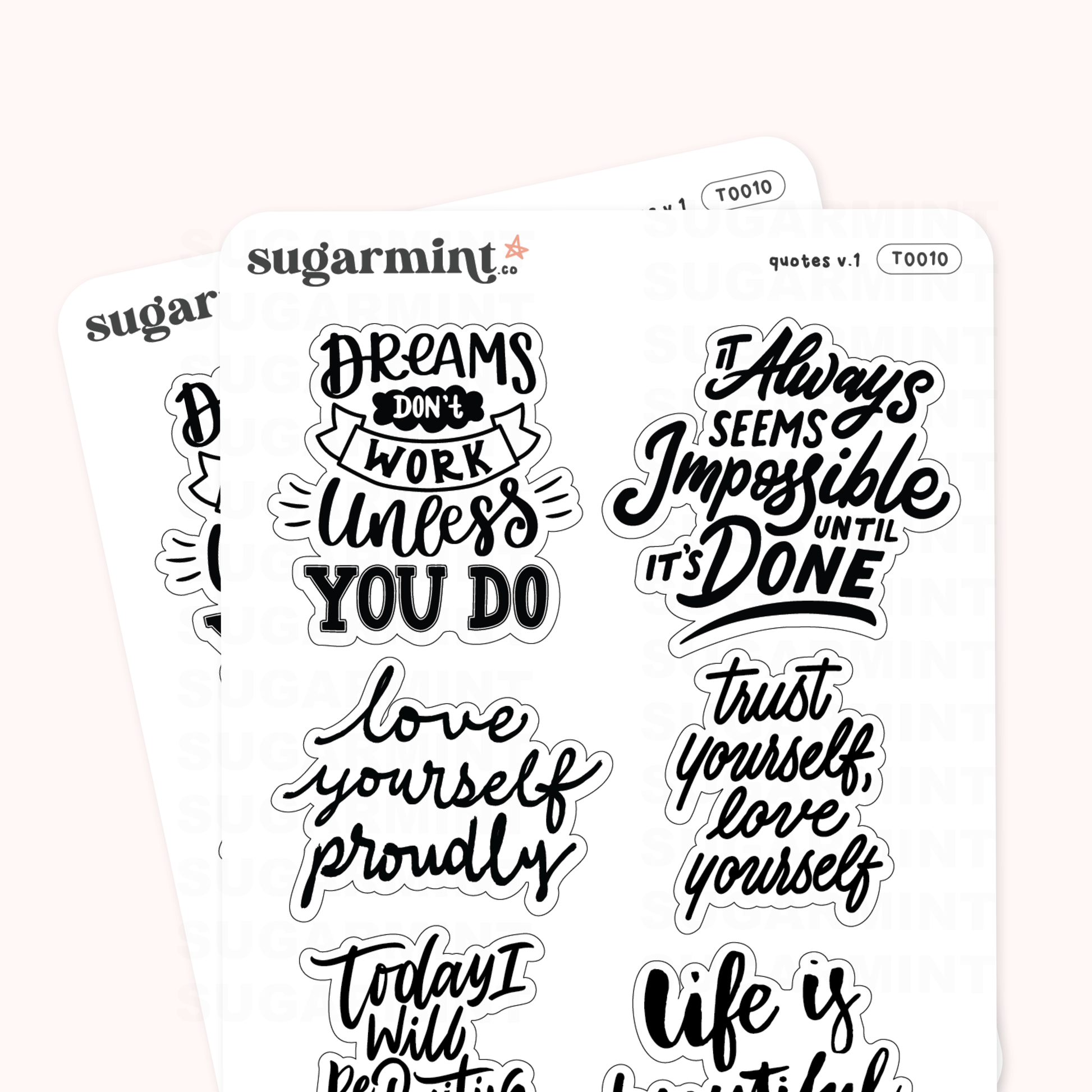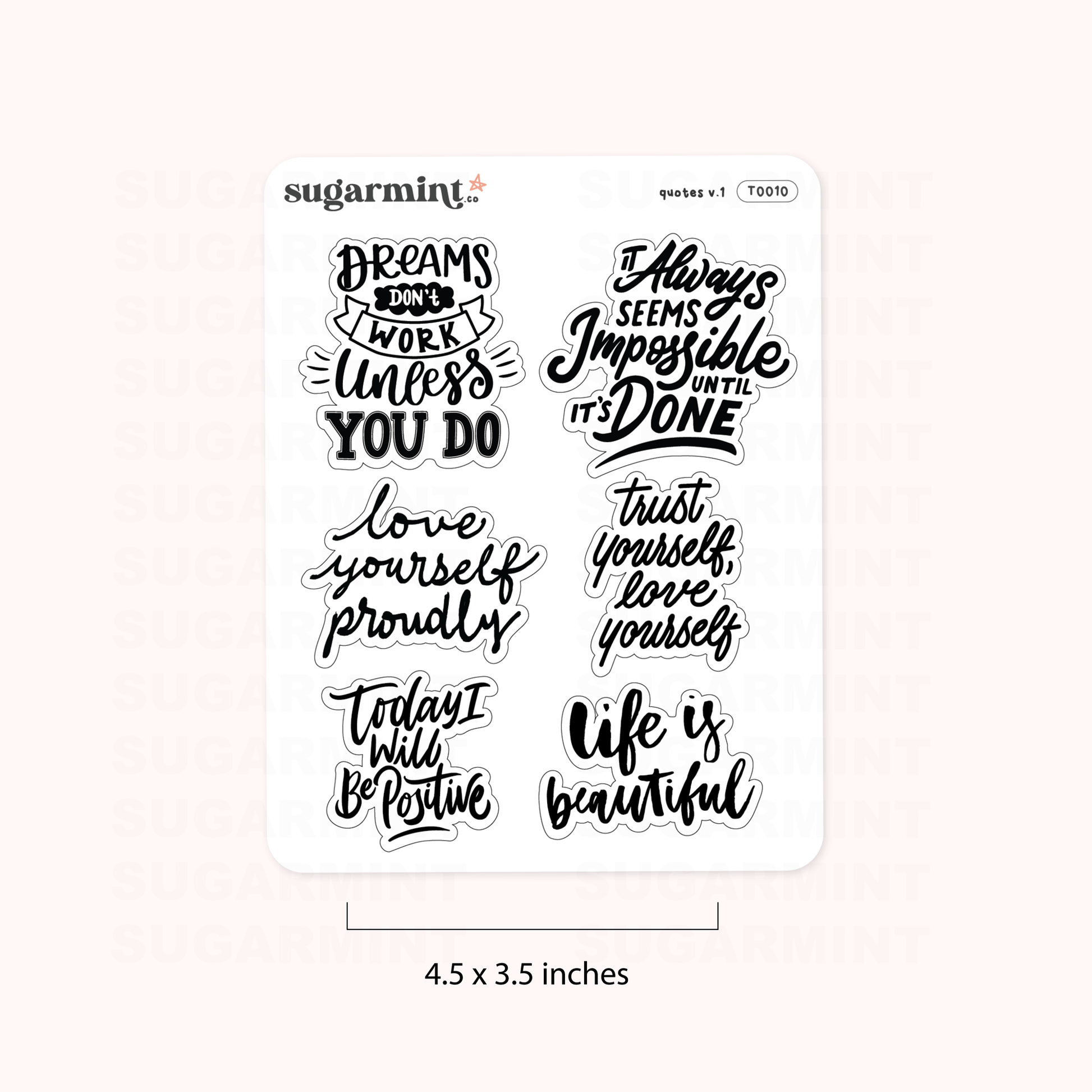 Introducing our new sheet of positive quote stickers, perfect for adding some inspiration to your planner! Featuring uplifting phrases such as "Dreams don't work unless you do" and "Life is beautiful," these stickers are a must-have for anyone looking to stay motivated and focused. Each sticker is carefully crafted with beautiful typography and printed on mattes sticker paper, ensuring they will last and look great in your planner. Add these stickers to your daily routine and let them help you stay inspired and positive!