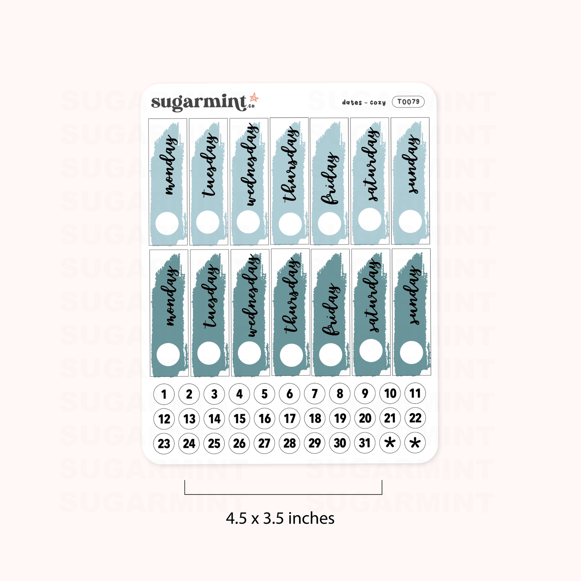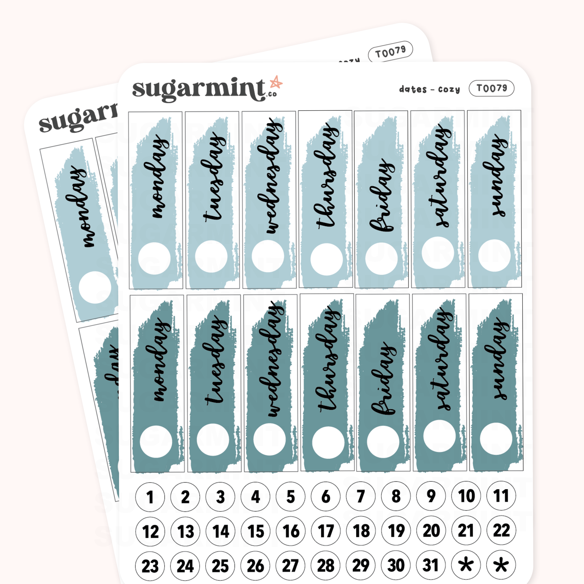 This sticker sheet comes with two weeks worth of date covers! Date covers are perfect for bullet journaling and undated planners. We offer the sheets as printable or printed. Each sheet measures 4.5 x 3.5 inches and is printed on Matte Sticker Paper!