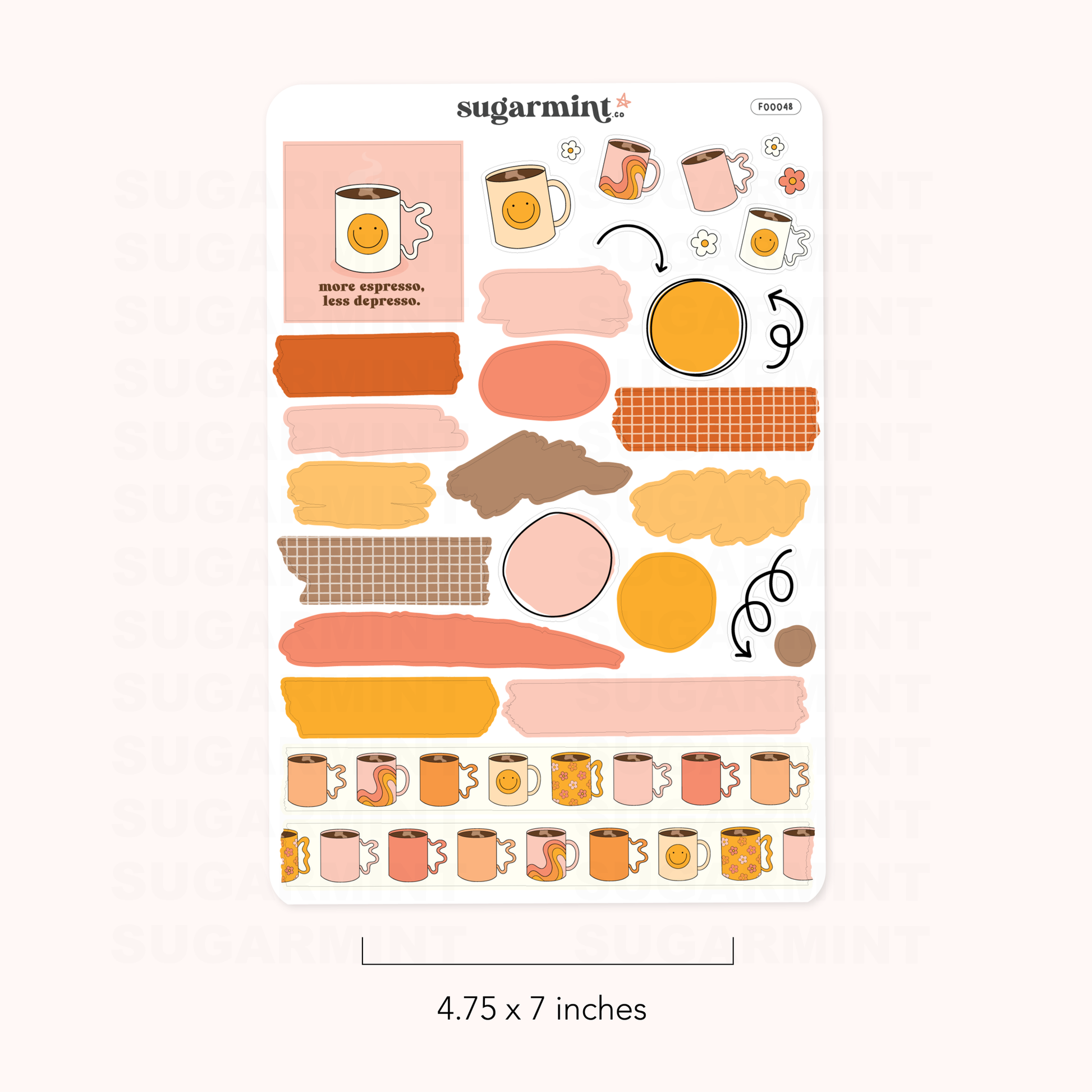 Introducing our Espresso collection! This planner sticker collection features adorable espresso mugs in warm colors for a fun and cute touch. Say goodbye to feeling depresso and hello to more espresso with these stickers.