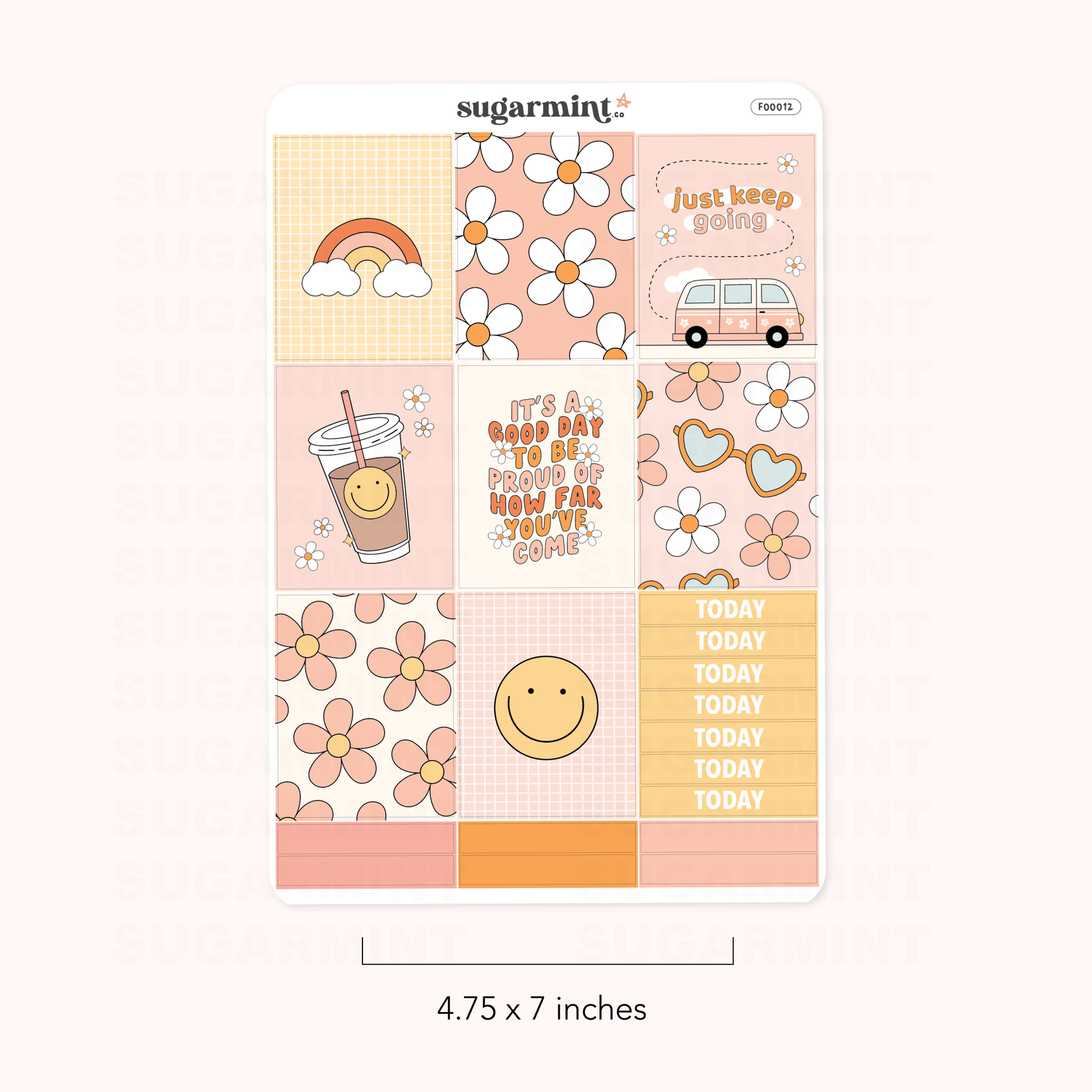 Introducing our new "It's a Good Day" collection! This sticker sheet includes a variety of decorative planner boxes, each measuring 1.5 x 1.9 inches, featuring sunglasses, flowers, coffee, and cute icons.