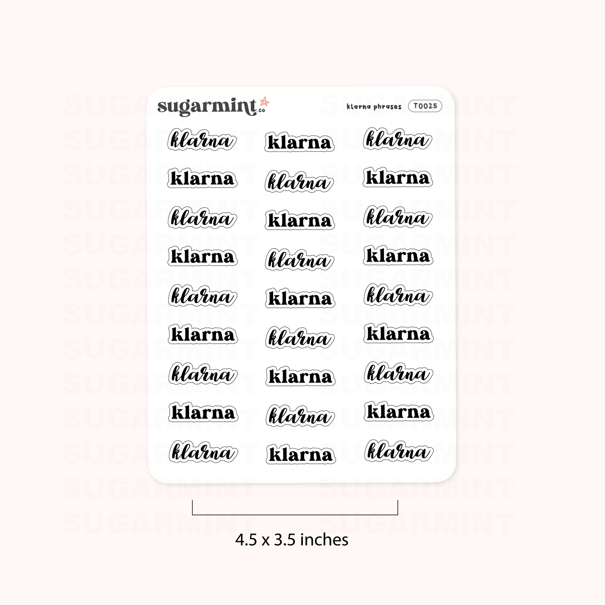 These black 'Klarna' script stickers are a practical addition to any planner. Printed on matte sticker paper, they're durable and easy to apply. Use them to mark your Klarna payment reminders or simply to stay organized. With their sleek and simple design, these stickers are a versatile and practical choice for any planner.