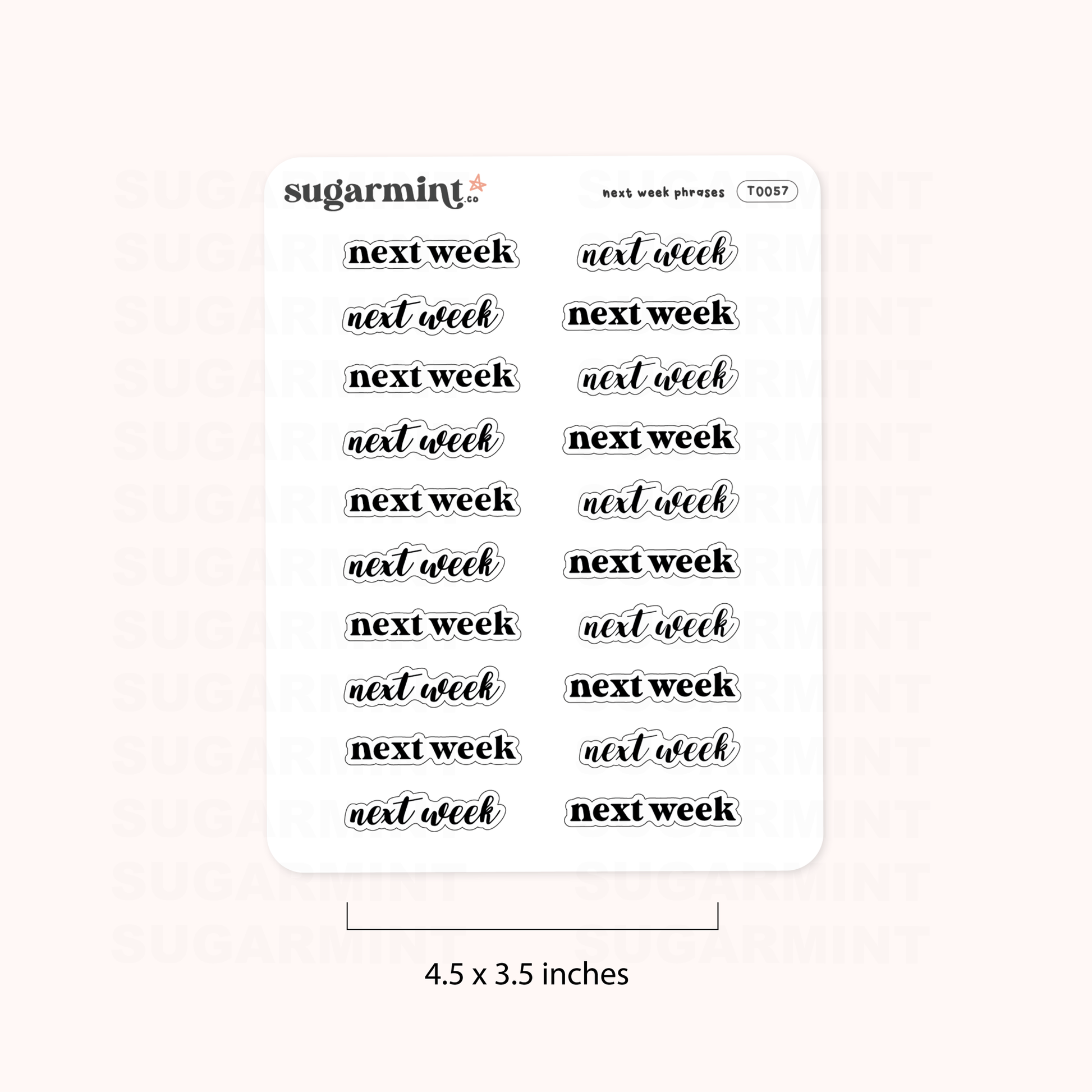 These black "Next Week" script stickers are a practical addition to any planner. Printed on matte sticker paper, they're durable and easy to apply. Use them to mark your upcoming schedule or to plan for the next week. Each sticker sheet measures 3.5 x 4.5 inches, making them a convenient and stylish choice for any planner. With their sleek and simple design, these stickers are a versatile and practical way to stay organized.