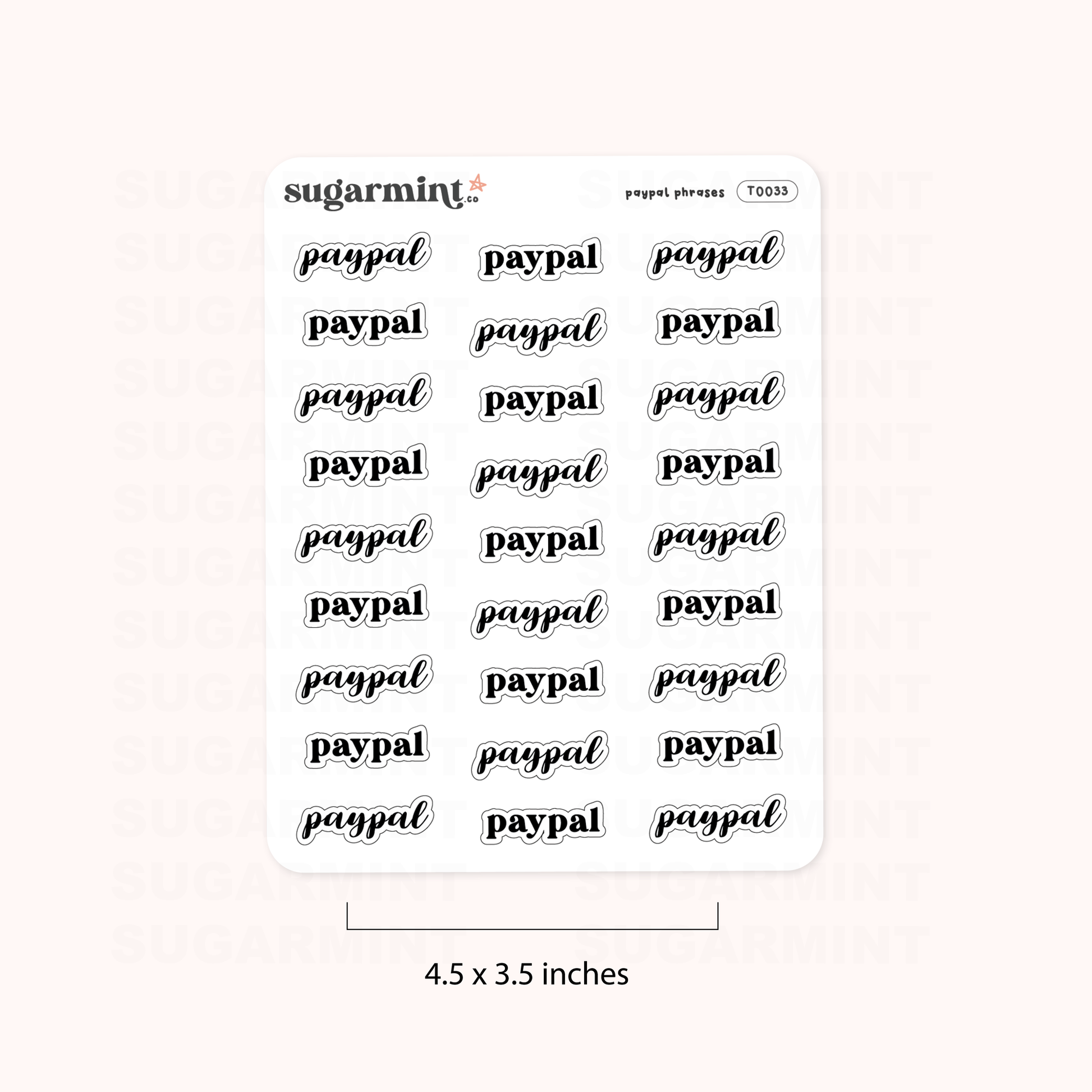 These black 'PayPal' script stickers are a practical addition to any planner. Printed on matte sticker paper, they're durable and easy to apply. Use them to mark your payment reminders or simply to stay organized. With their sleek and simple design, these stickers are a versatile and practical choice for any planner.