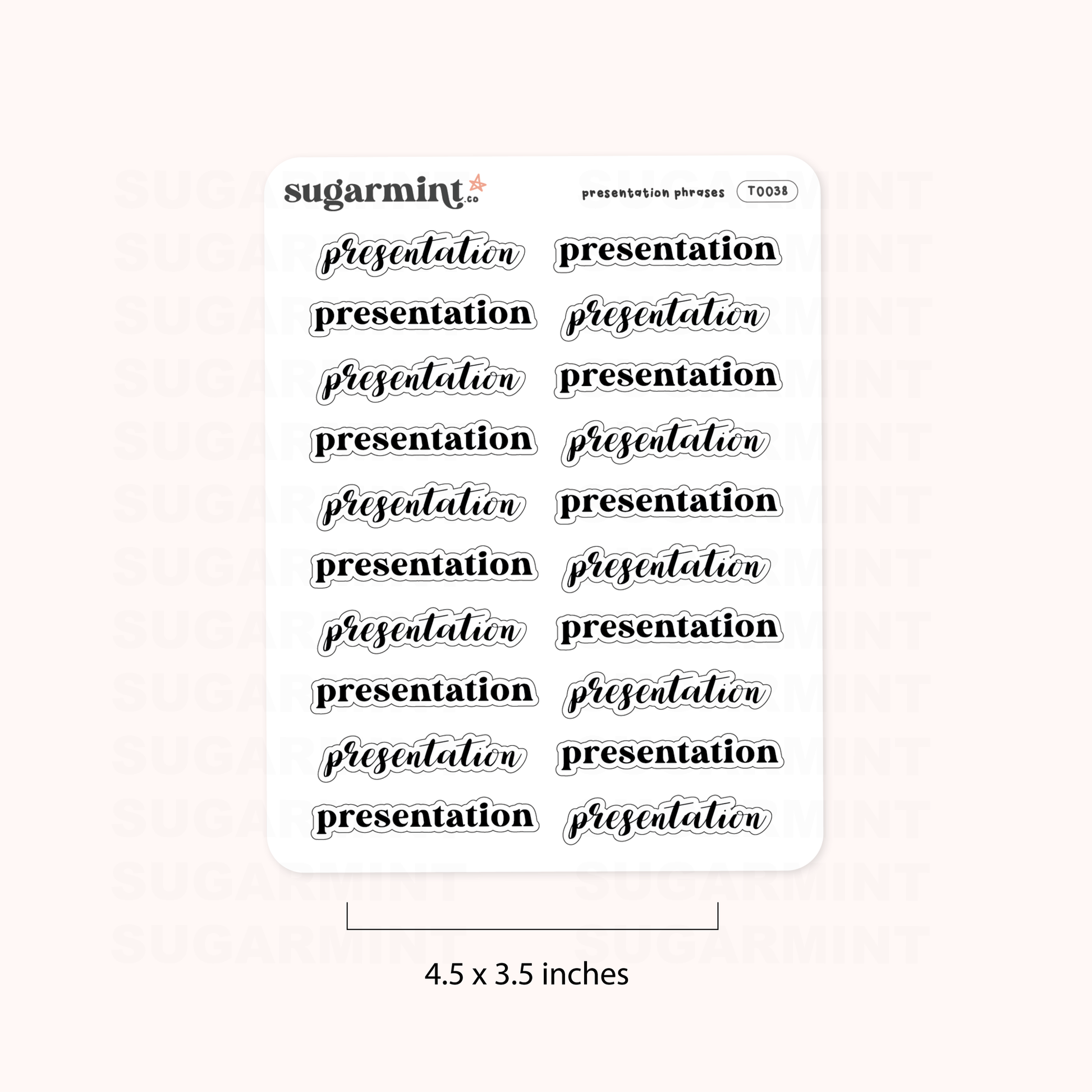These black 'Presentation' script stickers are a great way to stay organized and on top of your game. Printed on matte sticker paper, they're durable and easy to apply. Use them to mark your presentation schedule or to remind yourself of important deadlines. With each sticker sheet measuring 3.5 x 4.5 inches, these stickers offer plenty of space for all your planning needs.
