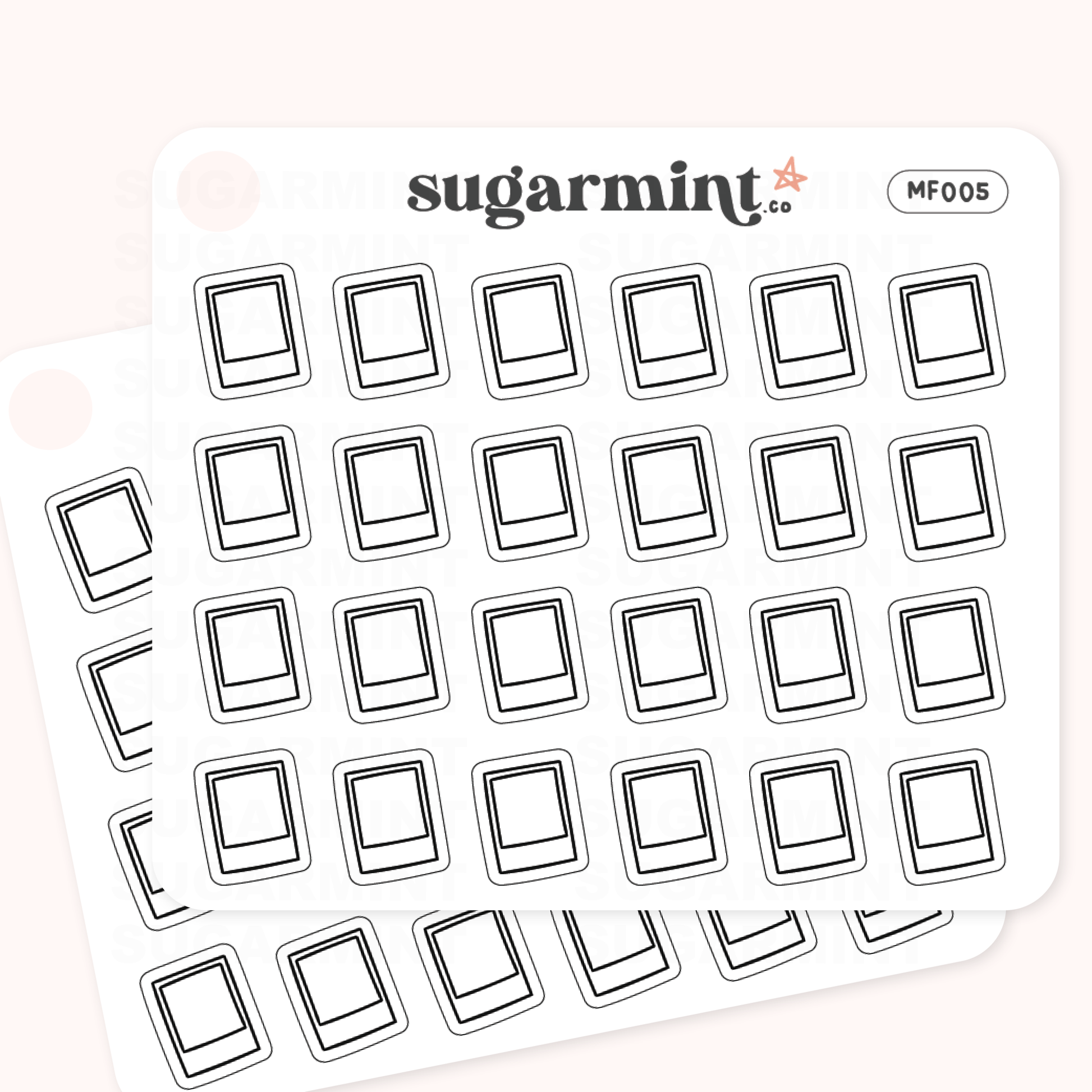 Organize your day with style using our Polaroid Icon Stickers! These minimal black and white stickers are the perfect addition to your planner or journal for reminders and to-do lists. Made from matte sticker paper, they are durable and designed to last. Each sheet measures 2.5 x 2.9 inches, making them easy to use and store. Get yours today and start planning in style!