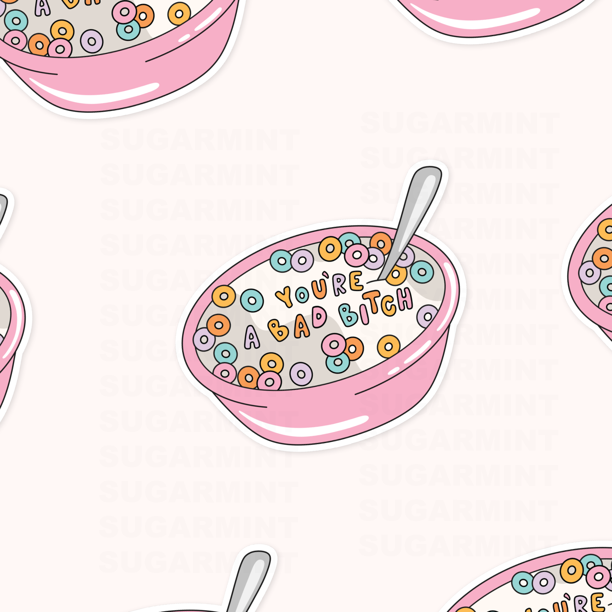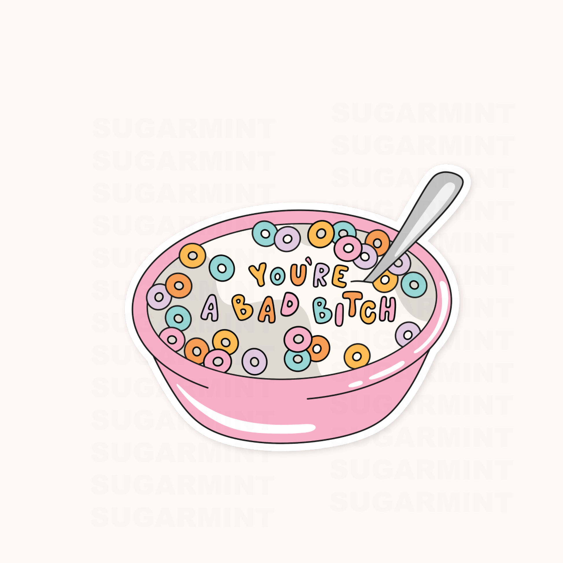 Add some sass to your belongings with our "You're a Bad Bi***" die-cut sticker. Featuring a bowl of pastel-colored cereal spelling out the phrase, this sticker is sure to make a statement. Let your inner bad bitch shine with this fun and quirky sticker.